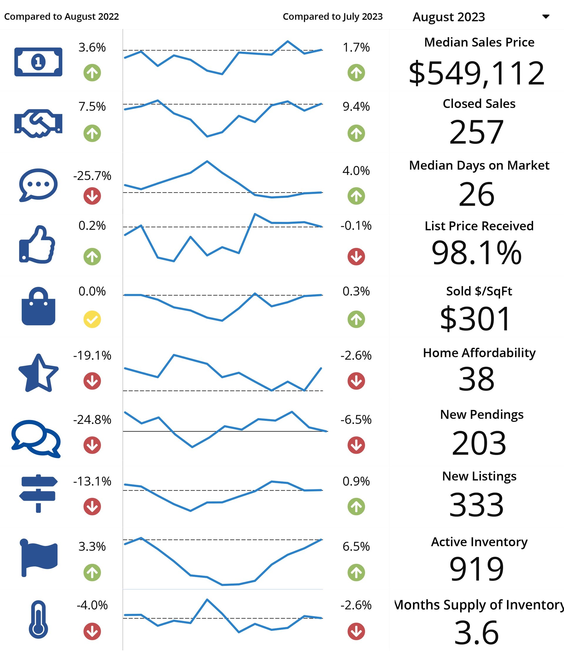 In August 2023, 345 homes were sold across the region, a 5.5% increase compared to the 327 homes sold in August of 2022. The sales increase is mainly due to Prescott Valley's record-breaking month, which saw a 24.4% rise with 97 total sales.